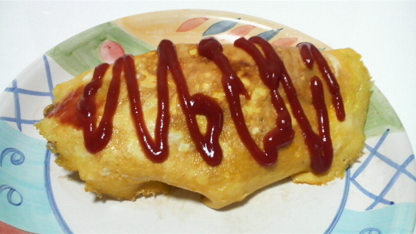 9.そしてフライパンをひっくり返すと綺麗に包めます。最後にケチャップをかけて出来上がり★